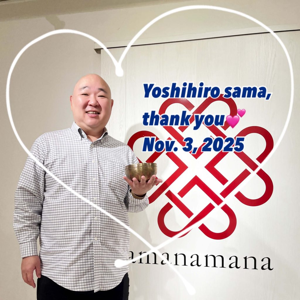 ヨガの先生をなさっているYoshiroさま。定期的に開催されているヨガや瞑想の参加者の方から、アマナマナのシンギングボウルを見せてもらい、今回、ぜひご自分の耳で響きを確かめ、手に取ってお選びになりたいとご来店くださいました💕